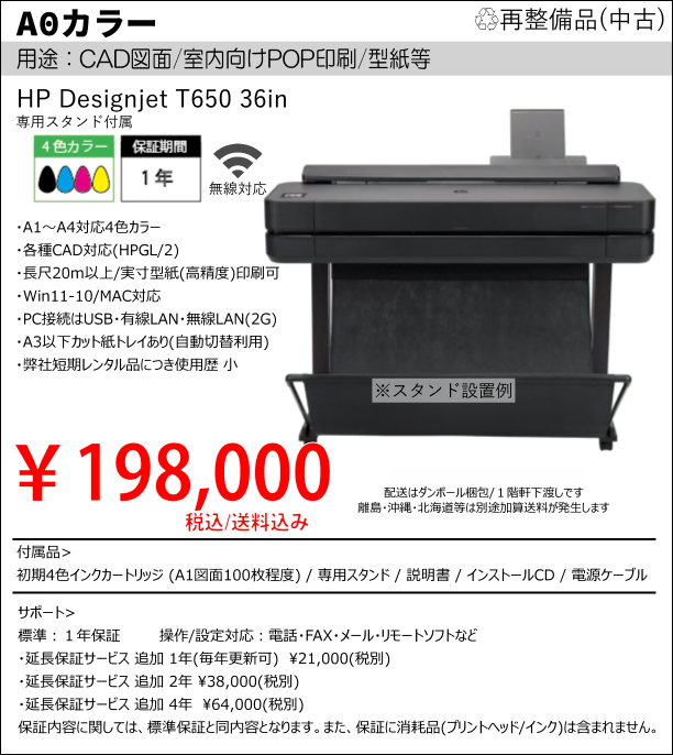 モノクロダウングレードモデルについて 元がカラーのモデルを、実質的にモノクロのみで運用できるようにカスタマイズしたモデルです。ランニングコストはモノクロのみでOK。後日、カラーへ戻すことも可能です。 用途:図面・型紙(高精度は要確認) 対応OS:Windows10/8/7/Vista/XP/旧OS MAC OS USB・パラレルポート・有線LAN(オプション\2,750) モノクロ1色・ロール紙自動カット対応 設置幅123cm 半年保証 付属品: WindowsDRIVER・電源ケーブル・取扱説明書 ・インク1色(ハーフ) 専用スタンド別売り(+\5,500) 備考: >>メンテナンス整備済み 延長保証サービス 保証期間2年間 +\12,000(税込) 保証期間3年間 +\23,000(税込) ![]() |